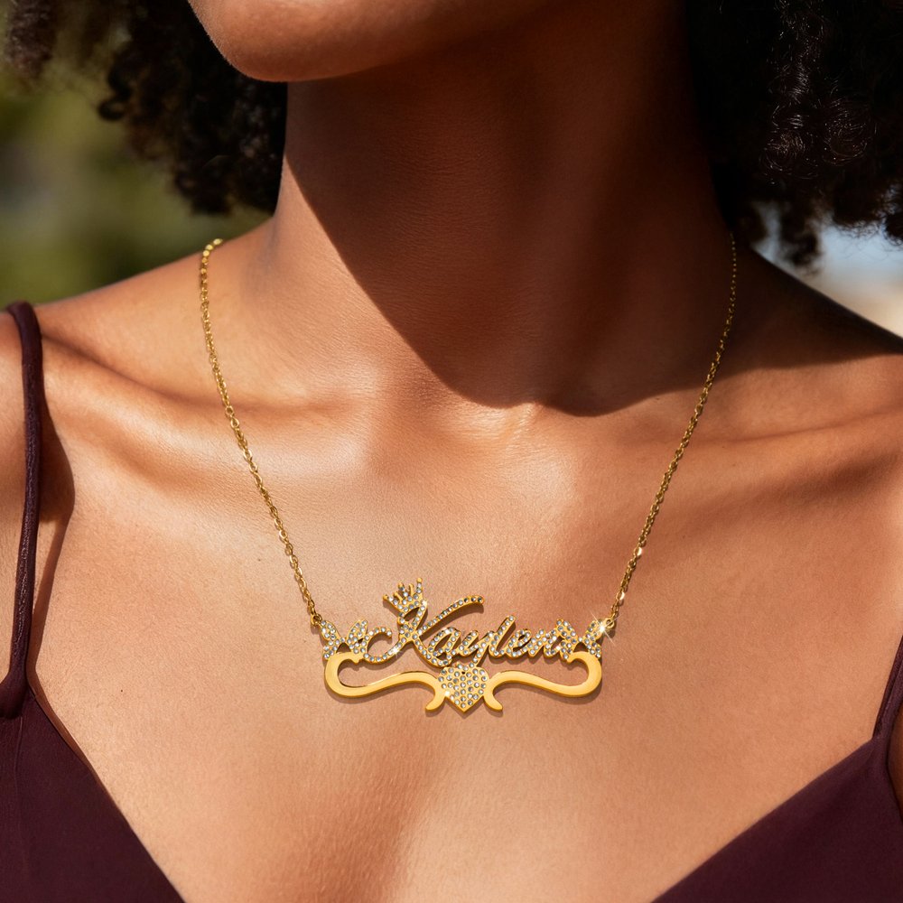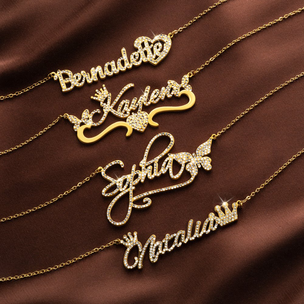Features an elegant script-style nameplate fully inlaid with sparkling crystals, crafted to catch the light beautifully and highlight Personalised lettering with a luxurious, high-end look. Supports complete customization of any name in a handwritten script style, transforming each necklace into a one-of-a-kind piece that reflects personal identity and style.
